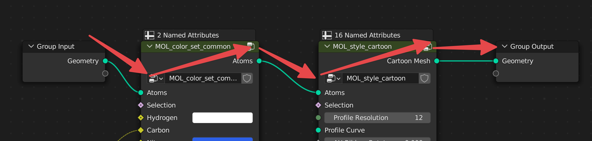 In short, the atomic data comes through the Group Input on the left, and the final 3D model goes out the Group Output to the right. Each node in between performs some actions on the data. The first node changes the colours of the atoms. The last node applies the given style. When importing we chose the Cartoon style default, so we have a cartoon node.