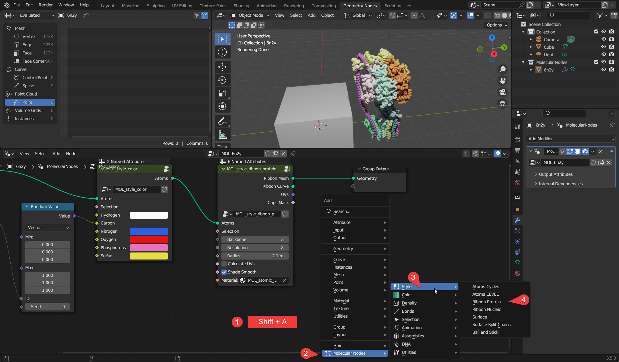 The protein is now imported in the scene. To change the way the protein is displayed, we have to use the Geometry Nodes editor. This is where we change the nodes that are use to process the underlying atomic data, resulting in the final 3D object we can see in front of us.