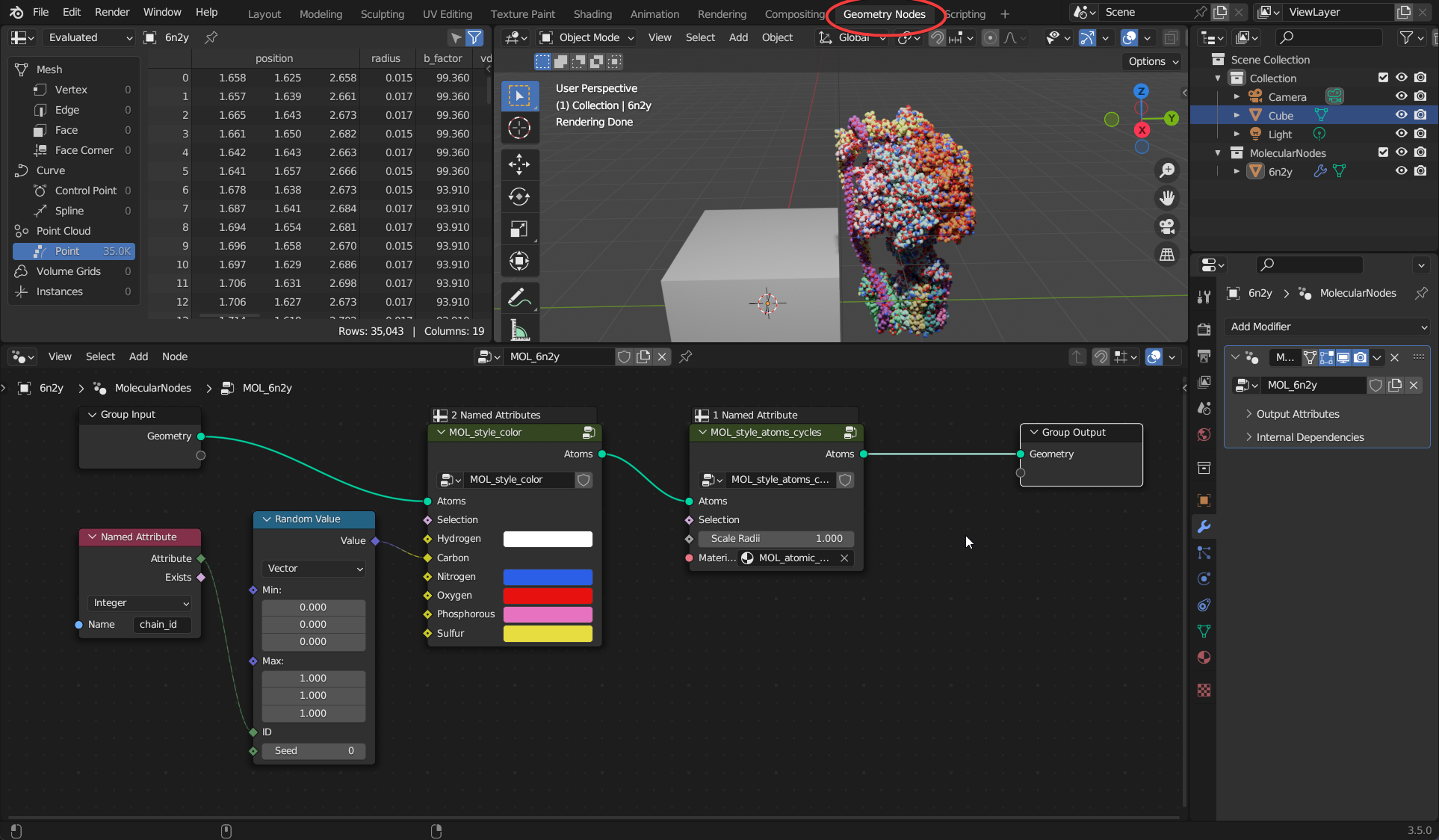 It is probably ill-advised to manually edit the atomic data by hand, but it is important to understand the structure of the data inside of Blender & Molecular Nodes.