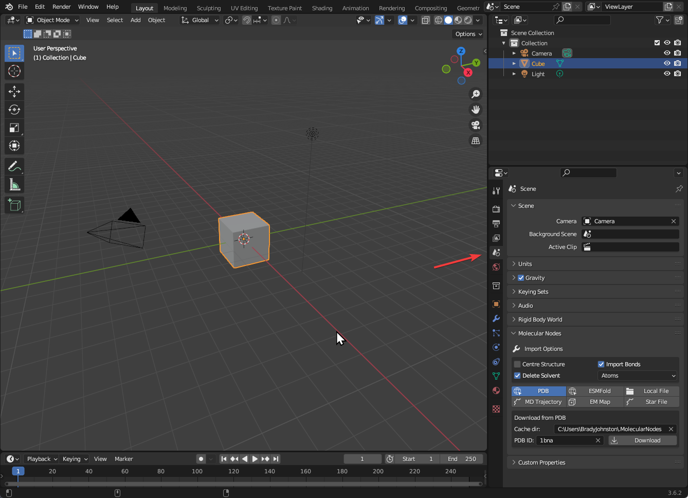 Molecules, simulations and other file formats can all be imported via the Molecular Nodes subpanel. This panel can be found under the Scene Properties panel. This is the small cone and spheres icon on the right. This contains all of the different options for importing molecular data currently available inside of Molecular Nodes.