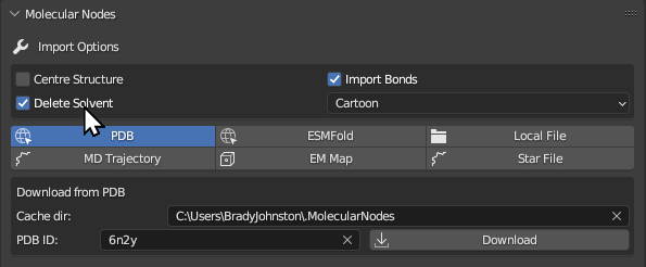 In this tab you can input the PDB ID to be used for downloading the structure. You can also change where Molecular Nodes caches the downloaded structures. By default it will be in a hidden .MolecularNodes folder in your home directory.